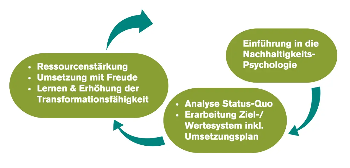 - Basierend auf den Erkenntnissen der Psychologie der Nachhaltigkeit fördern wir die persönlichen Ressourcen (z. B. Sinn, Achtsamkeit, Selbstwirksamkeit), die die Menschen in Ihrem Unternehmen unterstützen, Veränderungsprozesse wirkungsvoll und mit Freude zu gestalten.